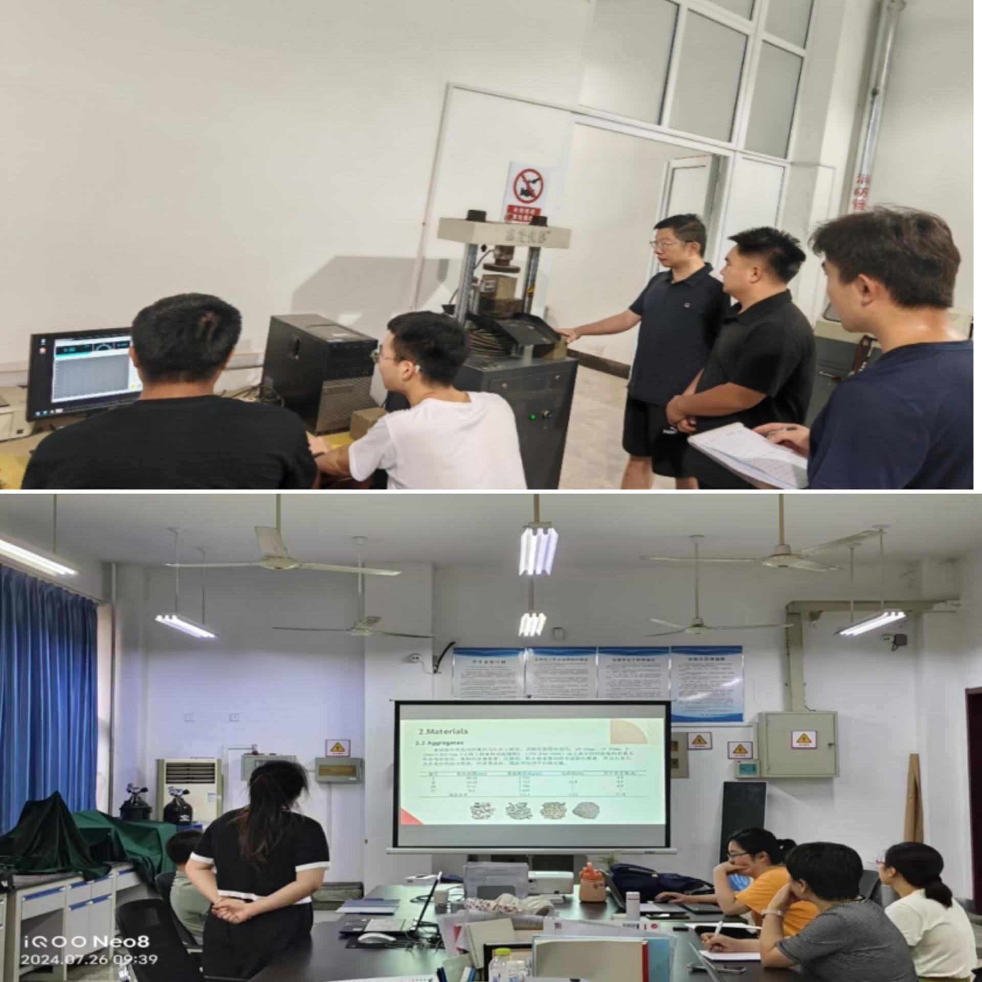 交通土建工程学院各研究课题组炎炎夏日不放松。泡沫轻质土研究课题组成员们在刘勇老师的带领下,专注于泡沫轻质土的配方优化、性能测试以及应用前景的研究,为找到最佳的配方和制备工艺进行大量试验,攻克难题和挑战;学院王彦敏教授团队与金曰公司合作开展交通运输厅课题路表光催化降解汽车尾气材料的研发及应用,团队成员刘小村、王晓宁、齐美丽和研究生在暑假期间针对项目进展情况进行分析,针对现有问题提出解决方案,为后续铺设示范路段及现场施工做好准备工作。