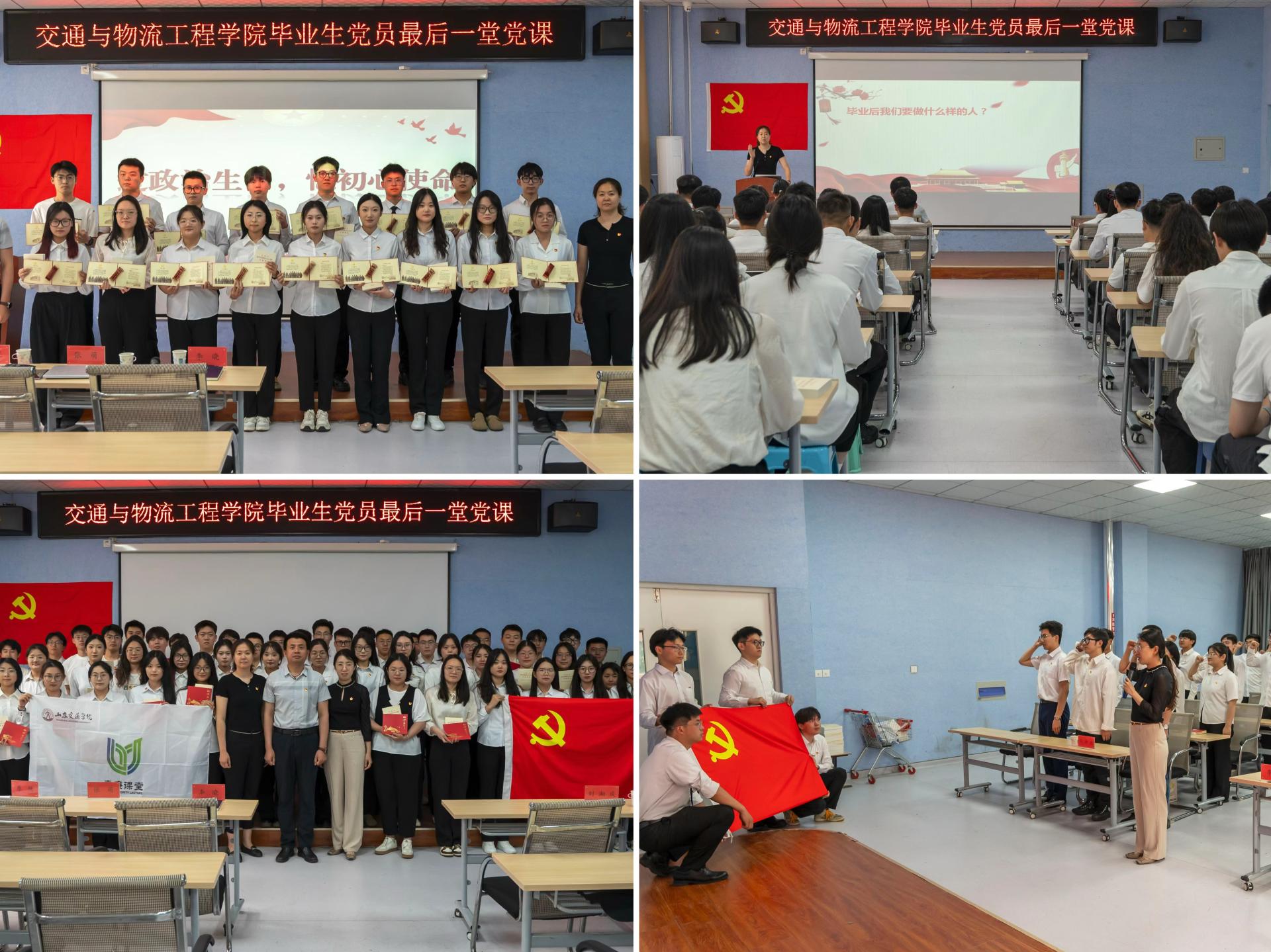 交通与物流工程学院党委开展“最后一堂党课”主题党日活动。学院党委副书记李晓为毕业生党员送上“政治生日”贺卡,勉励大家坚定理想信念、永葆党员本色,以饱满的青春热情、良好的精神风貌踏入人生新征程;学院副院长张萌为毕业生党员赠送书籍,讲授纪律党课,告诫同学们要牢记初心使命,坚守学术道德,时刻发挥好党员的先锋模范作用;学院专职组织员带领全体毕业生党员重温入党誓词,集体观看警示教育片《家声》。