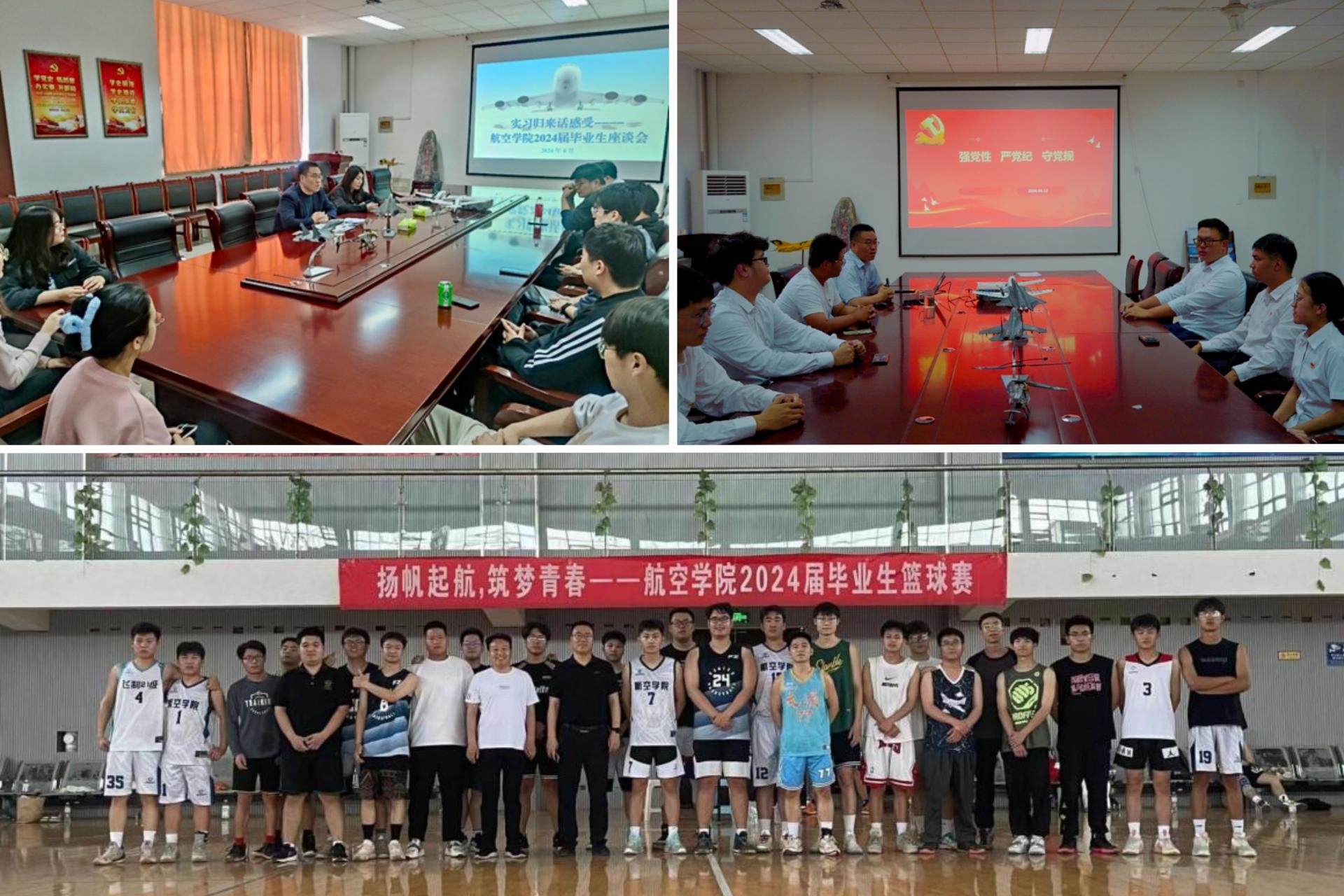 航空学院开展2024年毕业季系列活动。学院开展“实习归来话感受——2024届毕业生座谈会”,毕业生代表围绕实习感受、课程设置、职业规划、就业选择等方面说想法、谈体会、提建议;学院党委副书记周德杰以“强党性、严党纪、守党规”为题,为学院毕业生党员讲授纪律党课,引导毕业生党员遵守党规党纪,以身作则、率先垂范、积极作为,切实发挥党员的先锋模范作用;学院举办“扬帆起航 筑梦青春”2024届毕业生篮球赛,用团结奋进、奋勇拼搏的精气神激励毕业生在未来道路上勇往直前。