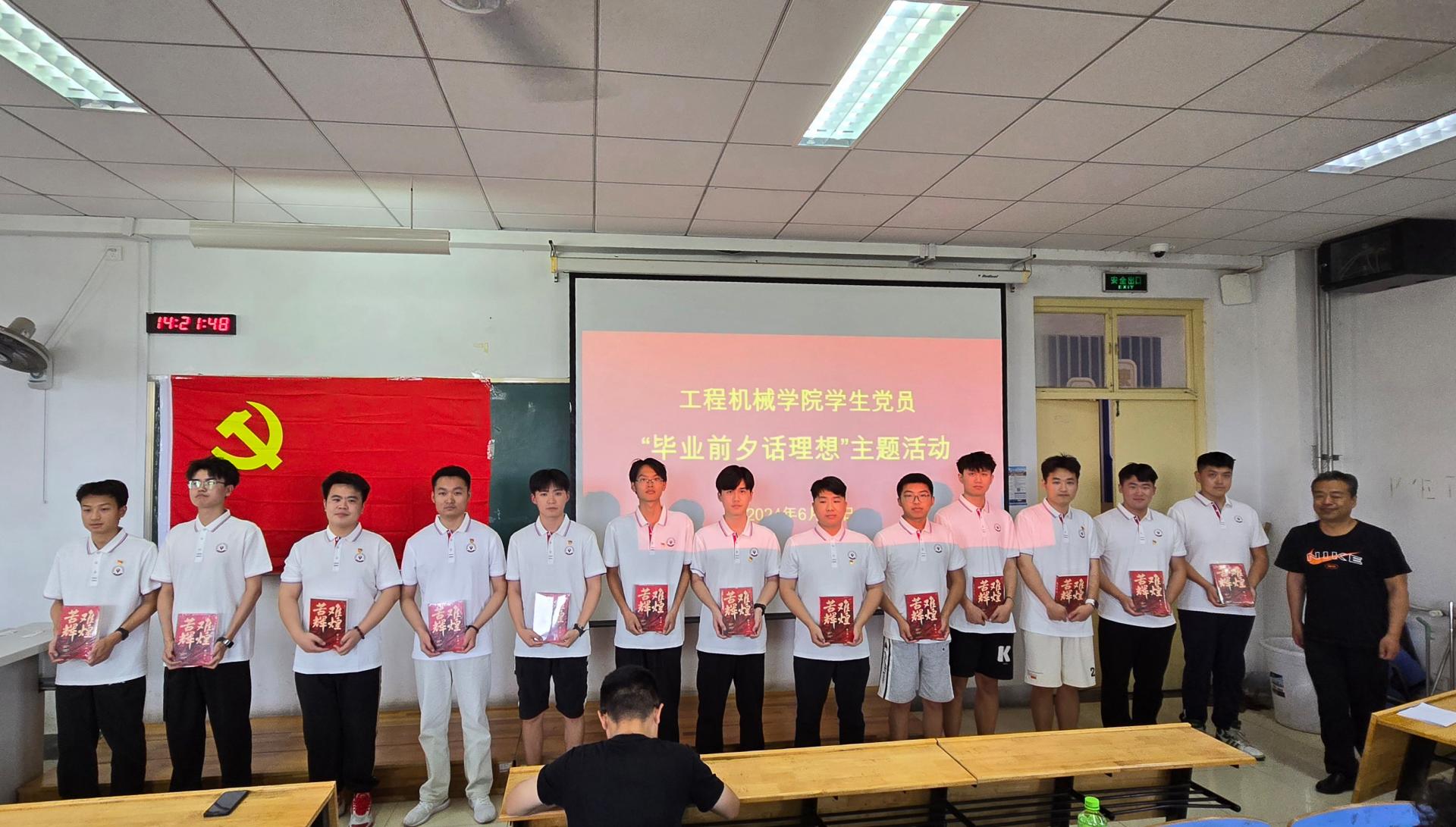 工程机械学院开展学生党员“毕业前夕话理想”活动。活动中,陈加峰以《知行知止 担当作为 主动投身交通强国建设》为题,为毕业生党员讲授纪律党课,他勉励大家要坚守纪律底线、坚持学以致用,牢记共产党员的身份,把个人成长融入到党和国家发展事业之中,积极投身交通强国建设一线,争做有理想、敢担当、能吃苦、肯奋斗的新时代好青年;全体党员面对党旗重温入党誓词;毕业生党员代表回顾了在校学习成长历程,表达了对学校感激之情和对未来发展的思考规划。
